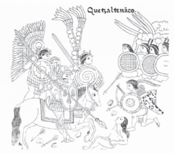 Pedro de Alvarado e seu exército avançaram ao longo da costa do Pacífico sem oposição até alcançarem o rio Samalá no oeste de Guatemala. Essa região fazia parte do reino Kʼicheʼ, e um exército Kʼicheʼ tentou, sem sucesso, impedir que os espanhóis cruzassem o rio. Uma vez atravessado, os conquistadores saquearam os assentamentos próximos numa tentativa de aterrorizar os Kʼicheʼ.[4] Em 8 de fevereiro de 1524, o exército de Alvarado travou uma batalha em Xetulul, chamado Zapotitlán por seus aliados mexicanos (atual San Francisco Zapotitlán). Embora tenha sofrido muitas baixas causadas pelos arqueiros Kʼicheʼ defensores, os espanhóis e seus aliados invadiram a cidade e estabeleceram acampamento no mercado.[75] Alvarado então dirigiu-se rio acima, rumo à serra em direção ao coração dos Kʼicheʼ, cruzando o desfiladeiro até o fértil vale de Quetzaltenango. Em 12 de fevereiro de 1524, os aliados mexicanos de Alvarado foram emboscados no desfiladeiro e repelidos pelos guerreiros Kʼicheʼ, mas a carga de cavalaria que se seguiu foi um choque para os Kʼicheʼ, que nunca haviam visto cavalos. A cavalaria dispersou os Kʼicheʼ e o exército atravessou para a cidade de Xelaju (atual Quetzaltenango), que se encontrava deserta.[76] Embora a visão comum seja que o príncipe Kʼicheʼ Tecun Uman tenha morrido na batalha posterior, próxima a Olintepeque, os relatos espanhóis deixam claro que pelo menos um, e possivelmente dois, dos senhores de Qʼumarkaj morreram nas intensas batalhas durante a aproximação inicial a Quetzaltenango.[77] A morte de Tecun Uman, segundo se diz, ocorreu na batalha de El Pinar,[78] e a tradição local relata que sua morte ocorreu nas Planícies de Urbina, na aproximação de Quetzaltenango, próximo à atual vila de Cantel.[79] Em sua terceira carta a Hernán Cortés, Pedro de Alvarado descreveu a morte de um dos quatro senhores de Qʼumarkaj durante a aproximação a Quetzaltenango. A carta, datada de 11 de abril de 1524, foi escrita enquanto ele permanecia em Qʼumarkaj.[78] Quase uma semana depois, em 18 de fevereiro de 1524,[80] um exército Kʼicheʼ confrontou o exército espanhol no vale de Quetzaltenango e foi completamente derrotado; muitos nobres Kʼicheʼ estavam entre os mortos.[81] Foram tantas as baixas Kʼicheʼ que Olintepeque passou a ser chamado de Xequiquel, significando aproximadamente "banhado em sangue".[82] No início do século XVII, o neto do rei Kʼicheʼ informou ao alcalde maior (o mais alto funcionário colonial da época) que o exército Kʼicheʼ que saiu de Qʼumarkaj para enfrentar os invasores contava com 30.000 guerreiros, uma afirmação considerada plausível pelos estudiosos modernos.[83] Essa batalha esgotou os Kʼicheʼ militarmente, que então pediram paz e ofereceram tributo, convidando Pedro de Alvarado a entrar em sua capital, Qʼumarkaj, também conhecida pelos aliados nahuas espanhóis como Tecpan Utatlan. Alvarado, profundamente desconfiado das intenções dos Kʼicheʼ, aceitou a oferta e marchou para Qʼumarkaj com seu exército.[84]