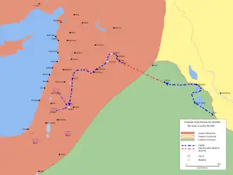 Mapa do movimento do exército de Calide ibne Ualide em 634 a partir do Iraque