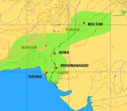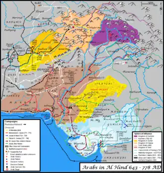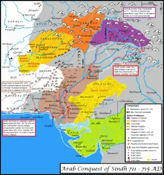 Bin Qasim partiu de Xiraz em 710 d.C., marchando pela costa até Makran. Ele subjugou as cidades de Fannazbur e Armabil antes de tomar Debal através de um assalto com o uso de catapultas (manjaniks).[37] Os árabes avançaram para norte ao longo do Indo; cidades como Nerun e Sadusan (Sehwan) renderam-se pacificamente. Bin Qasim cruzou o Indo e derrotou o exército de Dahir, que foi morto em batalha.[38] Brahmanabad, Alor e finalmente Multan foram capturadas. Em 713 d.C., os árabes chegaram ao sopé da Caxemira. Após a morte do Califa Walid em 715, Bin Qasim foi deposto. Jai Singh, filho de Dahir, recapturou Brahmanabad, e o domínio árabe ficou restrito à margem ocidental do Indo.