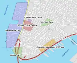 O novo local constituía um terreno em sua maior parte trapezoidal, com uma extensão ao norte que se assemelhava a uma "cortiça".[43] A maior parte do terreno era uma área de doze quarteirões delimitada pelas ruas Vesey, Church, Liberty e West, ao norte, leste, sul e oeste, respectivamente.[43][44] Todos esses quarteirões seriam combinados para formar o "superquarteirão" sobre o qual o World Trade Center foi construído.[44] A "cortiça" era um trapézio menor delimitado no sentido horário a partir do norte pela Barclay Street, West Broadway, Vesey Street e Washington Street. Isso se tornaria o local do 7 World Trade Center, embora esse edifício só tenha sido adicionado muito mais tarde. Os dois quarteirões a oeste e a leste da "cortiça" eram ocupados pelo Edifício Verizon e pelo Edifício Federal, respectivamente.[43]