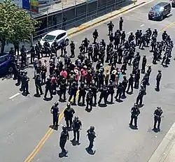 ![]() Um grande grupo de oficiais do Departamento de Polícia de Los Angeles encurrala um grupo de protesto pró-trans na South Commonwealth Avenue, a algumas quadras do Wi Spa, em 17 de julho de 2021. | ||||