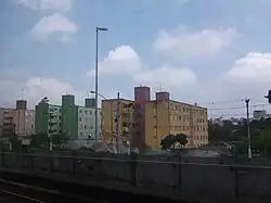 | Conjuntos habitacionais da COHAB em Artur Alvim vistos da janela de um trem do Metrô. Segundo a CPI da Poluição foram detectados nos apartamentos níveis de ruído de 75 decibéis (com picos de 85-90 decibéis) durante a passagem dos trens.[22] | Aspecto de via elevada do Metrô próxima à estação Parada Inglesa. Em meados de 2009, esse trecho recebeu painéis metálicos (vistos à direita) para minimizar o nível de ruído durante a passagem dos trens. | Trem do Metrô passa sobre elevado, no trecho entre as estações Sacomã e Tamanduateí, revestido com barreira acústica para minimizar a poluição sonora causada pelos trens. | Trem do Metrô passa sobre elevado, próximo à Estação Santo Amaro. Alguns trechos da Linha 5–Lilás também receberam painéis metálicos para minimizar o nível de ruído durante a passagem dos trens, já que uma parte da linha é elevada. |