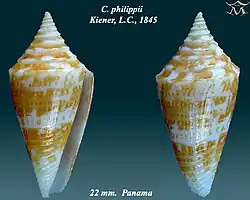 - ↑ a b Bouchet, P. (2015). Conus philippii Kiener, 1847. Accessed through: World Register of Marine Species at http://www.marinespecies.org/aphia.php?p=taxdetails&id=428240 on 2015-04-29