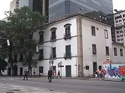 Vista atual do Convento do Carmo. Um moderno edifício revestido de janelas de vidro escuro foi construído logo atrás do convento colonial.
