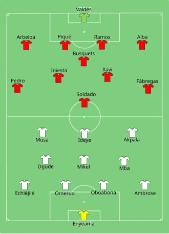 - ↑ a b «Tactical Line-up – Group B – Nigeria-Spain» (PDF) (em inglês). FIFA. 23 de junho de 2013. Consultado em 23 de junho de 2013