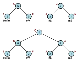 Por exemplo, para encontrar o caractere em i=10 na Figura 2.1, inicia-se no nó raiz (A), achar que 22 é maior que 10 e existe um nó filho à esquerda, então vá para este nó (B). 9 é menor do que 10, então, subtrai-se 9 de 10 (deixando-o i=1) e vá para a o filho à direita (D). Em seguida, porque 6 é maior que 1 e há um filho à esquerda, então vá para o nó filho à esquerda (G). 2 é maior que 1 e não há um nó filho à direita, então vá para a esquerda novamente (J). Finalmente, 2 é maior que 1, mas não há nó filho à esquerda, assim, o carácter de cada índice 1 da curta sequência de caracteres "na", é a resposta.