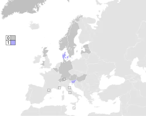 ![]() Participaram pelo menos uma vez Quiseram participar, mas retiraram-se antes da final Nunca participaram, mas estão autorizados | |