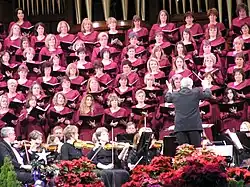 ![]() O Coro do Tabernáculo em apresentação no Tabernáculo da Praça do templo em Salt Lake City. | |