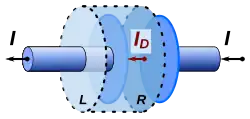 Mais ainda, essa corrente de deslocamento está relacionada ao carregamento do capacitor. Considere a corrente na superfície cilíndrica imaginária mostrada em torno da placa esquerda. Uma corrente, digamos I, sai pela superfície esquerda L do cilindro, mas nenhuma corrente de condução (nenhum transporte real de cargas) entra na superfície da direita R. Perceba que o campo elétrico E entre as placas aumenta à medida que o capacitor carrega. Isto é, da maneira descrita pela lei de Gauss, assumindo que não há dielétricos entre as placas:
