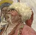 Para o cossaco com gorro escuro posou o colecionador e filantropo Vasily Tarnowski, Jr.. Em 1880, Repin passou na propriedade dele em Tarnow e fez um esboço do dono da propriedade. | ![]() |