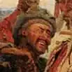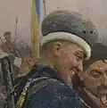 O soldado cossaco com uma atadura na cabeça por conta de um ferimento em batalha era o pintor da Academia de Arte ucraniano Nikolai D. Kuznetsov. A pintura simboliza a imagem de Ostap, o filho mais velho de Taras Bulba. | ![]() |