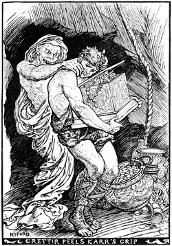 | “ | Tudo em seu caminho foi chutado para fora do lugar, a criatura tumular avançando com avidez horrenda; Grettir recuou diante dela por muito tempo, até que, por fim, percebeu que não podia mais poupar suas forças; agora nenhum dos dois se continha, e foram levados até onde estavam os ossos de cavalo, onde lutaram por muito tempo. Ora um, ora outro, caía de joelhos; mas o fim da luta foi que o habitante do túmulo caiu de costas com um estrondo enorme.[11] | ” |
