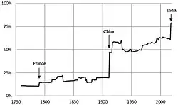 Durante a Revolução Francesa em 1791, a Assembleia Nacional Constituinte aboliu a lei contra a homossexualidade como parte da adoção de um novo código legal sem a influência do cristianismo. Embora a assembleia não tenha debatido a homossexualidade, ela tem sido legal na França desde então.[26][27] Anteriormente, poderia ser punida com queima até a morte, embora essa punição fosse raramente aplicada.[28][29] A abolição da criminalização da sodomia foi codificada no código penal de 1810.[30] As conquistas de Napoleão e a adoção do direito civil e códigos penais no modelo francês levaram à abolição da criminalização em muitas jurisdições – ou à substituição da pena de morte pela prisão.[31][32] Por meio da ocupação militar ou da emulação do código penal francês, os países escandinavos, Espanha, Países Baixos, Portugal, Bélgica, Japão e suas colônias e territórios – incluindo grande parte da América Latina – descriminalizaram a homossexualidade.[33] Ex-colônias francesas são menos propensas do que as britânicas a criminalizar a homossexualidade.[34][35] O Império Otomano é frequentemente considerado como tendo descriminalizado a homossexualidade em 1858 – quando adotou um código penal inspirado no modelo francês,[36] embora Elif Ceylan Özsoy argumente que a homossexualidade já havia sido descriminalizada.[37] No entanto, alguns homens otomanos foram executados por sodomia – incluindo dois rapazes em Damasco, em 1807.[38]