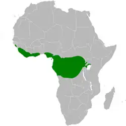 Pode ser encontrada nos seguintes países: Angola, Benin, Camarões, República Centro-Africana, República do Congo, República Democrática do Congo, Costa do Marfim, Guiné Equatorial, Gabão, Gana, Guiné, Guiné-Bissau, Libéria, Mali, Nigéria, Senegal, Serra Leoa, Sudão, Togo e Uganda.[1]