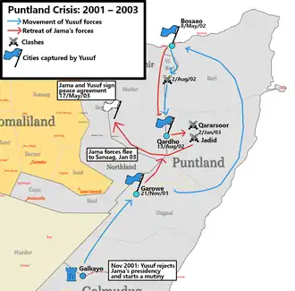 Sob o pretexto de combater o "terrorismo" e com o apoio do exército etíope,[4][5] Yusuf finalmente reafirmou o controle em maio de 2002, solidificando sua influência sobre Puntland.[6][7]