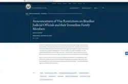 Em 18 de julho de 2025, dois dias após o anúncio das tarifas de Trump contra o Brasil e no mesmo dia em que a Polícia Federal realizou busca e apreensão na residência do ex-presidente Jair Bolsonaro, por associar o fim das tarifas à anistia, entre outros motivos,[40][41][42][43] e o Supremo Tribunal Federal aplicou medidas cautelares contra ele[44][45] o Secretário de Estado dos Estados Unidos anunciou a revogação dos vistos do ministro Alexandre de Moraes, seus aliados no tribunal e seus familiares imediatos. A justificativa foi que Moraes teria criado um "complexo de censura e perseguição tão amplo" que "não apenas viola os direitos básicos dos brasileiros, mas também se estende além das fronteiras do Brasil para atingir americanos" devido a suposta "caça às bruxas política" contra Bolsonaro.[46][47][48]