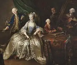 - ↑ Genealogie ascendante jusqu'au quatrieme degre inclusivement de tous les Rois et Princes de maisons souveraines de l'Europe actuellement vivans [Genealogy up to the fourth degree inclusive of all the Kings and Princes of sovereign houses of Europe currently living] (em francês). Bourdeaux: Frederic Guillaume Birnstiel. 1768. p. 93