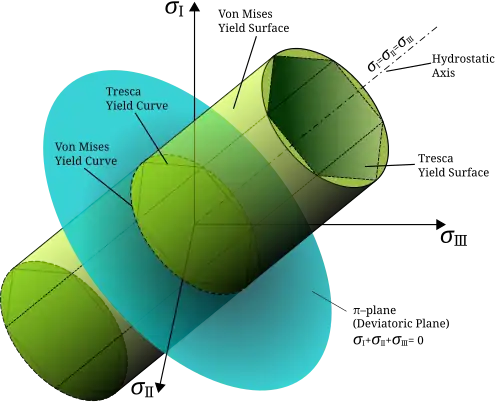 Esta equação define a superfície de escoamento como um cilindro circular (ver figura) cuja curva de escoamento, ou interseção com o plano deviatório, é um círculo com raio , ou . Isto implica que a condição de escoamento é independente das tensões hidrostáticas.