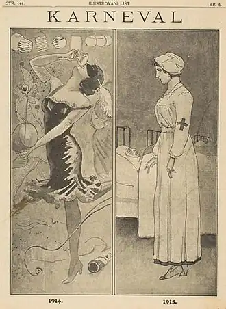 Uma caricatura de 1915 da revista Karneval mostra o forte contraste entre a vida em Zagreb antes e durante a guerra. | |