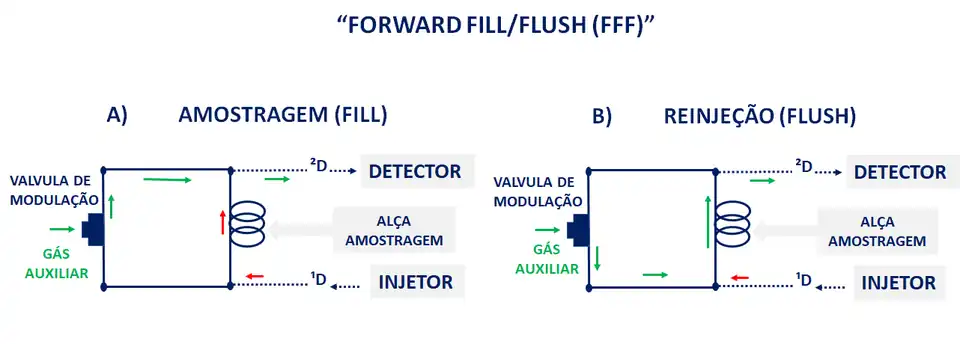 Os moduladores de fluxo que operam no modo forward fill/flush possuem a coluna ¹D conectada ao injetor e a coluna ²D ao detector, como mostrado na figura abaixo. A primeira etapa do processo de modulação é a acumulação (fill), isto é, o canal de coleta ou alça de amostragem é preenchida com o eluente da coluna ¹D (setas vermelhas) que sofre uma desaceleração da velocidade devido ao gás auxiliar proveniente da válvula que impede a passagem (aplicando pressão) do eluente da alça de amostragem para a coluna ²D (setas verdes) enquanto a válvula solenóide está no modo load (carregar). Em seguida, o eluente acumulado é rapidamente injetado, em aproximadamente 0,2 ou 0,3s, com a mudança da direção do fluxo de gás auxiliar da válvula de modulação entregando uma vazão de gás na coluna ²D. Os analitos são rapidamente separados na coluna ²D e o modulador está pronto para realizar o próximo ciclo (acumulação e injeção).[62]