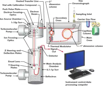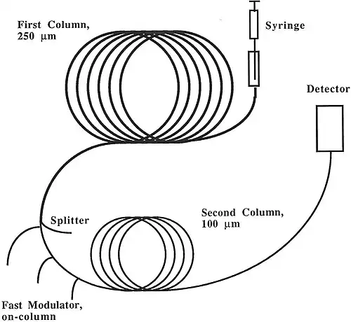Utilizando-se a GC×GC, otimiza-se o poder de separação de um sistema de cromatografia gasosa acoplando-se duas colunas independentes que têm seletividades distintas. Assim, o eluente da primeira coluna, de tamanho convencional, é conduzido para a segunda, mais curta, através de um modulador, que tem como funções principais segmentar e focalizar frações do efluente da primeira coluna e, após a focalização, liberá-lo para a segunda coluna.[9]