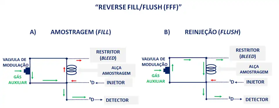 Por esses motivos, o modulador FFF caiu em desuso e atualmente o modulador de fluxo utilizado e disponível comercialmente é o “reversed fill/flush” (RFF), que possui maior flexibilidade em relação ao período de modulação e não gera atraso nos tempos de retenção como no modo FFF. A principal diferença entre os moduladores FFF e RFF está na direção do fluxo de gás que é reversa durante a etapa de reinjeção com auxílio de restritor.[62] Do mesmo modo que no modulador de fluxo FFF, o modulador RFF tem a coluna ¹D conectada ao injetor, a coluna ²D ao detector e um restritor conectado ao final da alça de amostragem como na figura abaixo. Dessa forma, as bandas cromatográficas eluem da ¹D e se direcionam para a alça de amostragem e são acumuladas (setas vermelhas) devido a aplicação de pressão pelo gás de arraste auxiliar (setas verdes).[62] Conectado ao final da alça de amostragem, o restritor é responsável por aliviar a pressão mas mantém o sistema pressurizado o suficiente para que o processo seja lento e etapa de acumulação ocorra. No processo de reinjeção, a válvula muda o sentido do gás de arraste em comparação com a coleta, de cima para baixo (setas verdes), e direciona o eluente na alça de amostragem para a coluna ²D gerando picos muito mais estreitos quando comparados com o modulador FFF.[64][65]