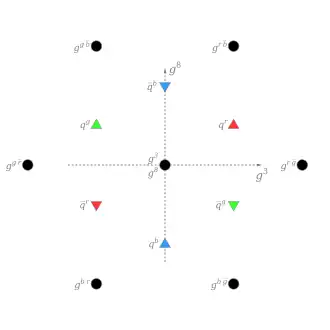 Os três tipos de cargas na QCD (em contraposição àquelas da QED) são denominadas carga de cor por uma analogia ligeiramente vaga às três cores percebidas por humanos (vermelho, verde e azul). As cargas de cor não correspondem a cores no sentido cotidiano ou visual. Os termos “vermelho”, “verde” e “azul” são apenas uma convenção de nomenclatura utilizada para distinguir os diferentes tipos de carga na cromodinâmica quântica.