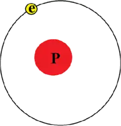 Esquema didático de um átomo de hidrogênio, mostrando um próton (em vermelho) e um elétron (amarelo).
