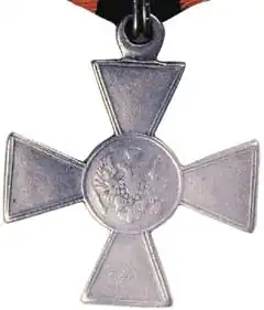 - Quarta classe: a mesma Cruz de Prata, na fita de São Jorge, sem laço; nas extremidades transversais do reverso da Cruz está gravado o número sob o qual o portador da Cruz de 4.ª classe foi incluído na lista de agraciados com esse grau, e na parte inferior a inscrição: 4.ª classe.