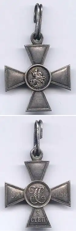 - Terceira classe: a mesma Cruz de Prata, na fita de São Jorge, com laço; nas extremidades transversais do reverso da Cruz está gravado o número sob o qual o portador da Cruz de 3.ª classe foi incluído na lista de agraciados com esse grau, e na parte inferior a inscrição: 3.ª classe.