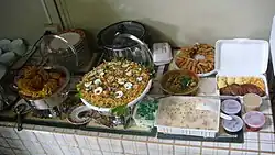 Em ocasiões festivas (fiestas), as pessoas se unem e preparam pratos mais sofisticados. As mesas geralmente estão repletas de iguarias caras e trabalhosas que exigem horas de preparação. Nas celebrações filipinas, o lechon (menos comumente soletrado como litson)[31] é o prato principal da mesa de jantar. Geralmente é um porco assado inteiro, mas leitão (lechonillo, ou lechon de leche) ou bezerros (lechong baka) também podem ser preparados no lugar do popular porco adulto. Normalmente é servido com molho de lechon, que é tradicionalmente feito com o fígado do porco assado. Outros pratos incluem hamonado (carne bovina, suína ou de frango curada com mel), relleno (frango recheado ou peixe-leite), mechado, afritada, caldereta, puchero, paelha, menudo, morcon, embutido (referindo-se a um prato de bolo de carne, e não a uma salsicha, como se entende em outros lugares), suman (uma mistura saborosa de arroz e leite de coco cozida no vapor em folhas como a bananeira) e pancit canton. A mesa também pode ter vários doces e bolos, como leche flan, ube, sapin-sapin, sorvetes, totong ou sinukmani (um pudim de arroz, leite de coco e feijão-mungo), ginataan (um pudim de leite de coco com vários vegetais de raiz e pérolas de tapioca) e gulaman (um ingrediente ou sobremesa semelhante à gelatina de ágar-ágar).