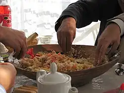 Uma refeição tajique "tradicional" começa com a mesa coberta com pequenos pratos com frutas secas, nozes, halva (torrão de pasta de nozes com açúcar) e outros doces, acompanhados com chá verde; outro acompanhamento é o chaka, queijo preparado com iogurte filtrado (sem soro), e kaymak (nata coalhada); a seguir é servida a sopa, a carne e no fim, o palav. Também chamado "osh", este pulau é também considerado o "prato nacional" dos tajiques (ver Afeganistão e Uzbequistão). A comida é servida numa mesa baixa, chamada “dastarkhan” e os convivas sentam-se à sua volta e vão-se servindo. A refeição não inclui talheres: as pessoas servem-se com as mãos dos pratos que se encontram no dastarkhan e acompanham a comida com “non”, ou seja pão feito com massa lêveda, assado no forno, como os “naan” do norte da Índia. [1]