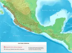 A cultura Capacha foi contemporânea de outras importantes culturas mesoamericanas como El Opeño em Michoacán, e da primeira fase de Tlatilco no vale do México. A extensão geográfica da distribuição das peças de cerâmica Capacha abarca toda a costa mexicana do Pacífico, desde Sinaloa a norte até Guerrero a sul. Especialmente relevantes são os enterramentos descobertos por Gordon F. Ekholm en Guasave, Sinaloa.