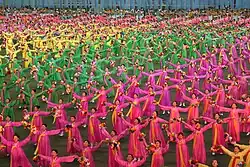 A Coreia do Norte é famosa por seus "jogos de massa", que são exposições onde milhares de norte-coreanos executam danças altamente coreografadas, especialmente danças tradicionais e ginástica, muitas vezes envolvendo ritmos simultâneos de movimentos. Os intérpretes cantam e dançam suas lealdades para com Kim Il-sung, para o Partido dos Trabalhadores da Coreia e para o princípio Juche.
