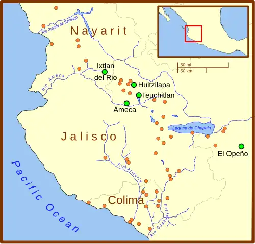 Uma vez que o México ocidental se encontra mesmo na periferia da Mesoamérica, é desde há muito considerado como estando fora da principal corrente mesoamericana e atualmente as suas culturas parecem estar particularmente isoladas de muitas das principais influências mesoamericanas.[41] Por exemplo, não foram recuperados nos túmulos de poço quaisquer artefactos com influência olmeca, nem tão pouco evidências de qualquer calendário ou sistema de escrita mesoamericanos,[42] embora estejam presentes alguns marcadores culturais mesoamericanos, sobretudo o jogo de bola mesoamericano.