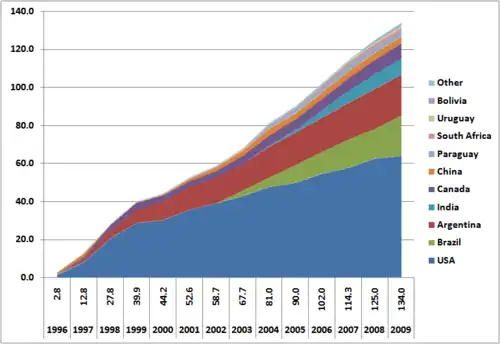 Em 1998, o cultivo experimental de organismos geneticamente modificados começou nos estados de São Paulo, Minas Gerais, Paraná e Rio Grande do Sul.[66] No mesmo ano, a Monsanto obteve autorização para o plantio comercial da soja Roundup Ready resistente ao glifosato. Contudo, uma liminar da Justiça Federal impediu a liberação do produto para consumo até a regulamentação da comercialização de OGMs e a realização de estudos sobre seus impactos ambientais.[66][67] Também em 1998, foi aprovado para cultivo comercial na União Europeia o uso de milho geneticamente modificado para conferir resistência a broca europeia do milho, sendo a primeira variedade transgênica plantada em Portugal em 1999.[68] A soja transgênica Roundup Ready, que já era cultivada de forma clandestina, recebeu aprovação provisória para cultivo no Rio Grande do Sul em 2003.[69] No ano de 2005, a soja transgênica foi liberada em todo o país, juntamente com o algodão geneticamente modificado resistente a insetos.[70] Em 2010, 29 países tinham plantado culturas geneticamente modificadas comercializadas e outros 31 países tinham concedido aprovação regulamentar para a importação de culturas transgênicas.[71]