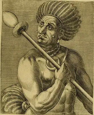 ![]() Cunhambebe ilustrado por André Thevet, um cosmógrafo francês que acompanhou a expedição de Nicolas Durand de Villegaignon | |