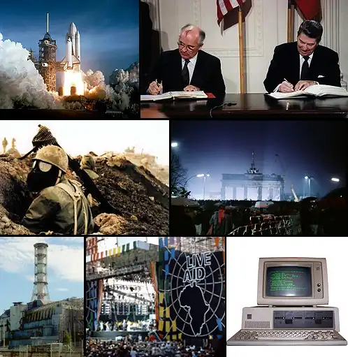 Da esquerda, no sentido horário: O primeiro ônibus espacial, Columbia, decola em 1981; O presidente americano Ronald Reagan e o presidente soviético Mikhail Gorbachov diminuem as tensões entre as duas superpotências, levando ao fim da Guerra Fria; A queda do Muro de Berlim em 1989 é considerada um dos eventos mais importantes da década de 1980; Em 1981, o IBM Personal Computer é lançado; Em 1985, o concerto Live Aid é realizado para financiar os esforços de ajuda no combate à fome na Etiópia durante o período em que Mengistu Haile Mariam governou o país; Ucrânia e grande parte da Europa são cobertas com detritos radioativos do desastre de Chernobyl, em abril de 1986; A Guerra Irã-Iraque leva a mais de um milhão de mortos e US$ 1 trilhão gastos.