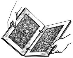 Este tipo de díptico tinha numa folha um relógio de sol vertical e na outra, um horizontal. A parte que fazia a sombra, chamada de gnomon, era um cordão entre elas, calibrado para permitir uma certa abertura, uma vez que ângulo entre as folhas era crítico. Este tipo de relógio de sol podia ser ajustado para qualquer latitude ajustando o artefato todo para que o gnomon ficasse paralelo ao eixo de rotação da Terra.