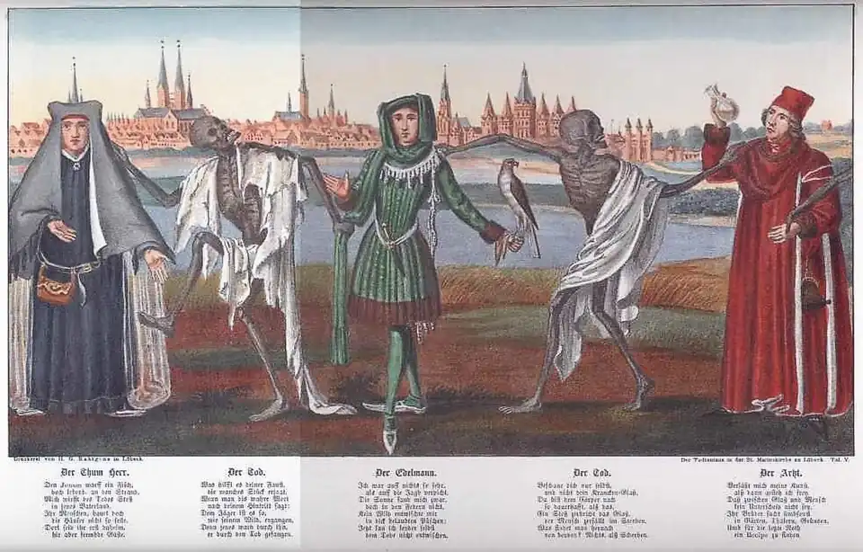 A dança macabra de Lübeck era considerada a mais bela da Alemanha, que tinha 24 figuras em uma paisagem bucólica, representando as diferentes classes sociais da época. À distância, avistava-se Lübeck e seu porto, onde cada figura era reconhecível por certas características.