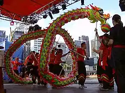 Em ocasiões de bom augúrio, incluindo o ano novo chinês, abertura das lojas e residências, os festivais incluem frequentemente dança com fantoches de dragão, até em carros alegóricos. Estes fantoches são feitos "sob medida" de pano e madeira e manipulados por uma equipe de pessoas. Elas carregam o dragão com varas no centro de atração e executam movimentos coreografados ao acompanhamento de tambor e música. Os dançarinos levantam, mergulham, empurram, e movem a cabeça, que pode conter as características animadas controladas por um dançarino e às vezes é equipada para soltar o fumo dos dispositivos pirotécnicos. A equipe de dança imita os supostos movimentos deste espírito do rio em uma maneira sinuosa, ondulada. Os movimentos tradicionais no espetáculo simbolizam papeis históricos dos dragões que demonstram o poder e a dignidade. A dança do dragão é um destaque das celebrações Ano Novo Chinês espalhado pelo mundo inteiro em bairros chineses. Ela tem presente muitos pulos e giros com o fantoche.