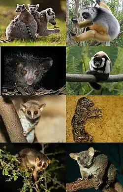 Uma amostra da diversidade de Strepsirrhini; oito gêneros biológicos são representados (de cima, da esquerda para a direita): Lemur, Propithecus, Daubentonia, Varecia, Microcebus, Darwinius, Loris, Otolemur