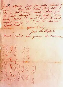 I keep on hearing the police have caught me but they wont fix me just yet. I have laughed when they look so clever and talk about being on the right track. That joke about Leather Apron gave me real fits. I am down on whores and I shant quit ripping them till I do get buckled. Grand work the last job was. I gave the lady no time to squeal. How can they catch me now. I love my work and want to start again. You will soon hear of me with my funny little games. I saved some of the proper red stuff in a ginger beer bottle over the last job to write with but it went thick like glue and I cant use it. Red ink is fit enough I hope ha. ha. The next job I do I shall clip the ladys ears off and send to the police officers just for jolly wouldn't you. Keep this letter back till I do a bit more work, then give it out straight. My knife's so nice and sharp I want to get to work right away if I get a chance. Good Luck.