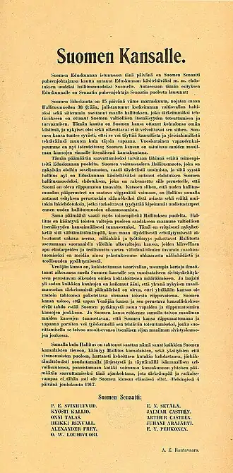 Ao mesmo tempo que o Governo quis que todos os cidadãos finlandeses soubessem estas palavras, o Governo recorre aos cidadãos, bem como às autoridades privadas e públicas, apelando a todos em seu próprio nome para que sigam a ordem (lei e) cumprindo o seu dever patriótico, para forçar todas as suas forças para alcançar o objetivo comum da nação neste momento., que tem tanta importância e determinação, que nunca houve antes na vida do povo finlandês. Em Helsínquia, 4 de dezembro de 1917.