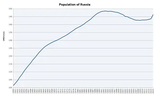 Em janeiro de 2020, a população russa foi estimada em 146,8 milhões de habitantes e uma densidade demográfica 9 hab./km².[1] A população se concentra na parte ocidental do país, onde se formam grandes centros urbanos. A parte central e a parte oriental, por serem regiões muito frias e isoladas, são escassamente povoadas. Cerca de 74% da população vive em áreas urbanas e cerca de 26% vive na área rural.