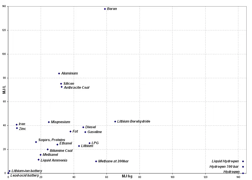 Densidade de energia gravimétrica e volumétrica de alguns combustíveis e tecnologias de armazenamento (modificado do artigo sobre gasolina):