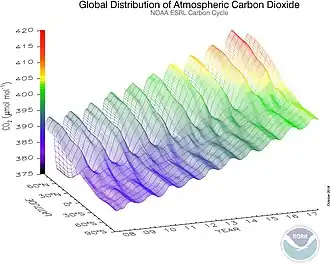 Desde o início da Revolução Industrial, a concentração atmosférica de CO2 tem aumentado, causando o aquecimento global e a acidificação dos oceanos.[13] Em outubro de 2023, o nível médio de CO2 na atmosfera da Terra, ajustado para a variação sazonal, era de 422,17 partes por milhão em volume (ppm).[14] Os números são publicados mensalmente pela Administração Oceânica e Atmosférica Nacional (NOAA).[15][16] O valor foi de cerca de 280 ppm durante os 10 000 anos até meados do século XVIII.[2][3][4]