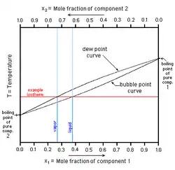 Um diagrama simples como exemplo com componentes hipotéticos 1 e 2 em uma mistura não azeotrópica é mostrada à direita. O fato que existem duas linhas curvas separadas unindo os pontos de ebulição dos componentes puros significa que a composição do vapor não é normalmente a mesma que a composição do vapor do líquido com o qual está em equilíbrio. Ver equilíbrio líquido-vapor para uma discussão completa.