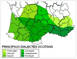 | alt = Mapa da França cujas áreas geográficas correspondentes aos dialetos são coloridas.]]