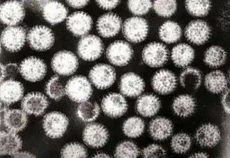 Microfotografia de um rotavírus, a causa de cerca de 40% das hospitalizações por diarreia em crianças com menos de cinco anos de idade.[1]